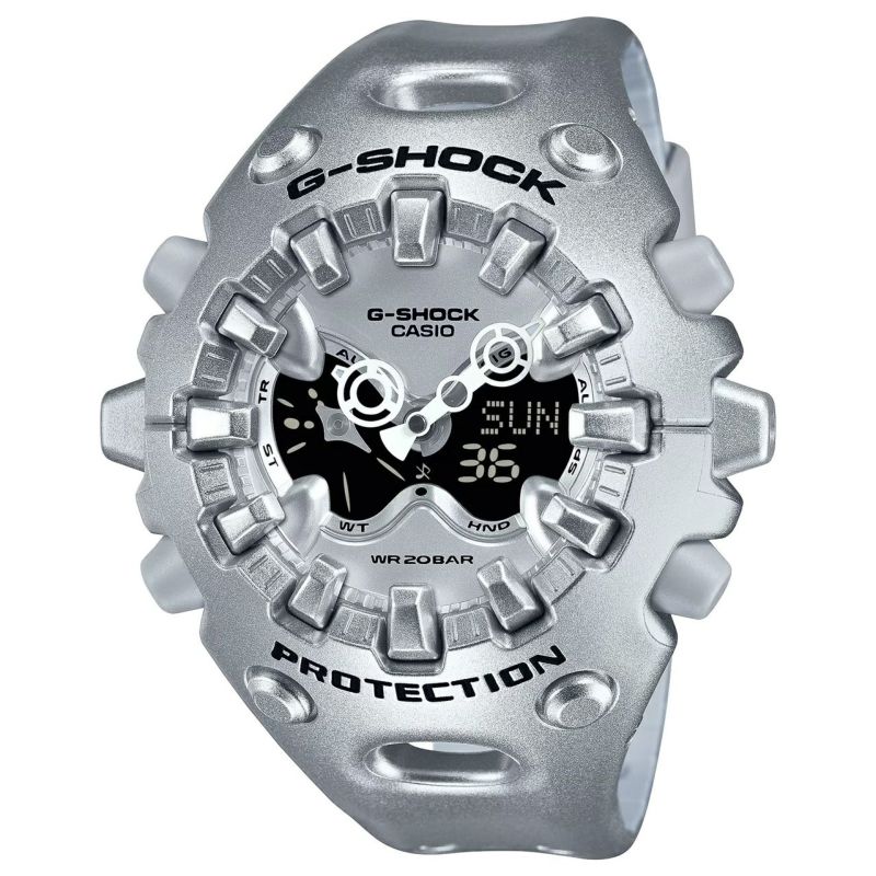 エッジの効いたパーツを組み合わせた有機的な外装フォルム、2つの穴が大きな特徴となっているショックリリース針など常識を覆す斬新な発想で、強さを求めて挑戦を続けるG-SHOCKのアイデンティティを形にしました。