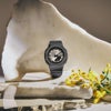 全身をダークグレーでまとめ、モノクロームの世界に広がる陰影の深さと力強さを表現。ゴールドの差し色は希望の光を表し、メタル素材の文字板は高級感のある輝きを放ちます。