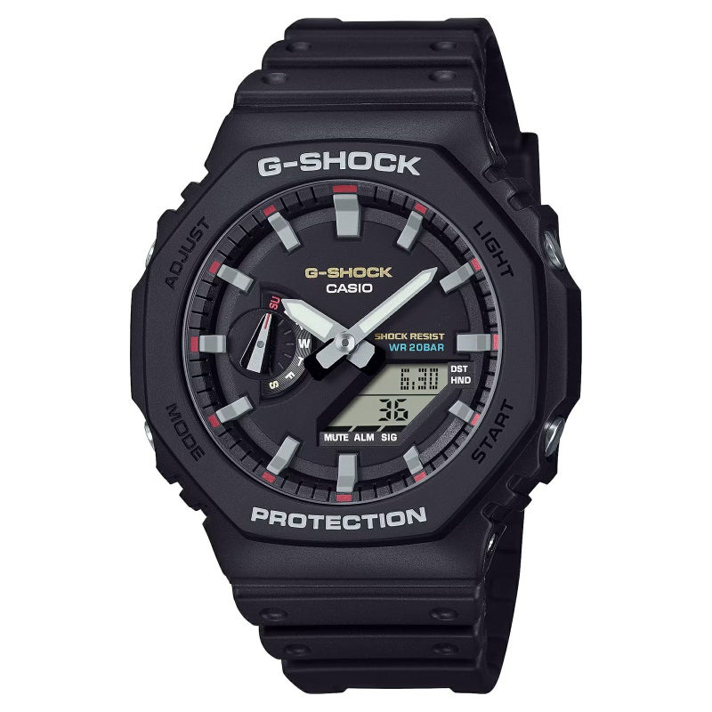 G-SHOCKのブランドカラーでもあり挑戦し続ける情熱を意味する赤色、高い防水性を表す青色、ショックレジスタントを意味する黄色をフェイスに配色し、オリジナルモデルのカラーを忠実に再現しています。