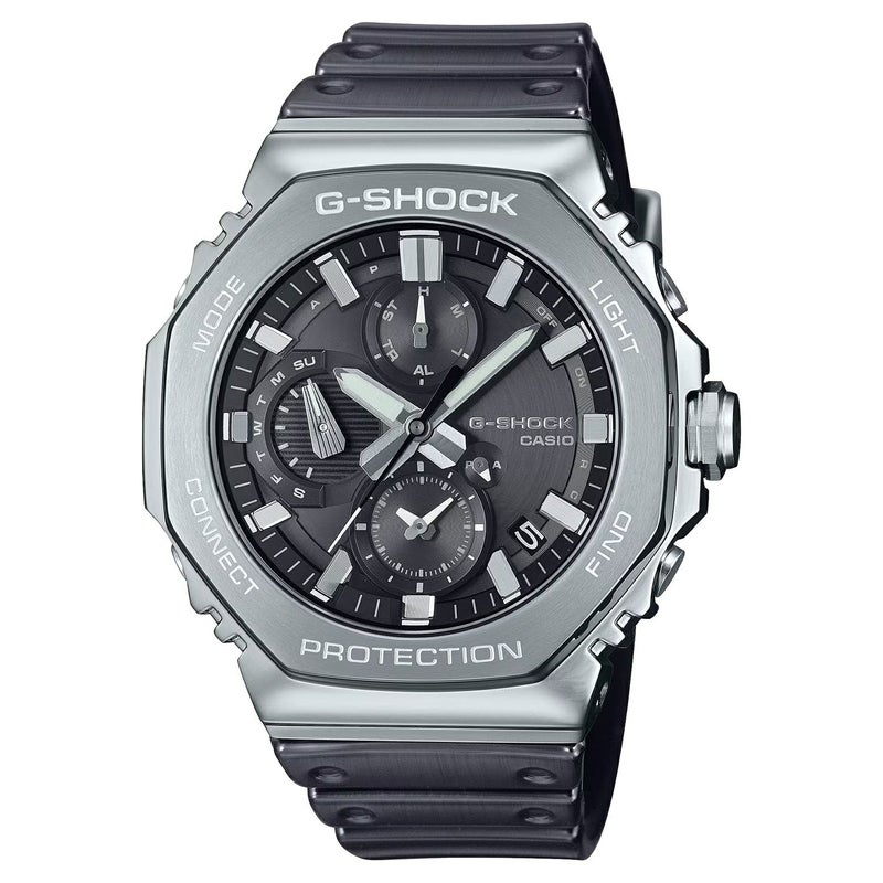 G-SHOCK初代モデルDW-5000Cのコンセプトを継承したアナログ「2100」シリーズのフルメタルクロノグラフです。ケースとベゼルにはステンレススチールを採用し、DW-5000Cに採用された八角形ベゼル形状を踏襲。ベゼルとケースの間にはファインレジン製の緩衝材を配置し、メタル外装ながら耐衝撃構造を実現しています。