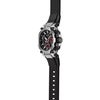 ステンレスのベゼルにブラックIPコーティングした後に、ヘアライン加工で再度仕上げを施して、凸面のみステンレスを露出させています。バンドにはブラックのウレタンバンドを採用し、シルバーとブラックのモノトーンボディに、フェイスのレッドが映えるデザインに仕上げました。