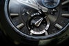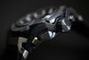 カーボン積層フレームは、シート状のカーボンとグラスファイバーを積層した母材を立体状に削り出し複雑造形のフレームを成形。ベゼルのステンレススチールパーツは内側と外側で2体ベゼルを採用。ヘアライン仕上げとミラー仕上げで部位ごとに磨き分け、美しく仕上げました。また、ベゼルなどのステンレススチールパーツにブルーグレーのIP加工を施しています。