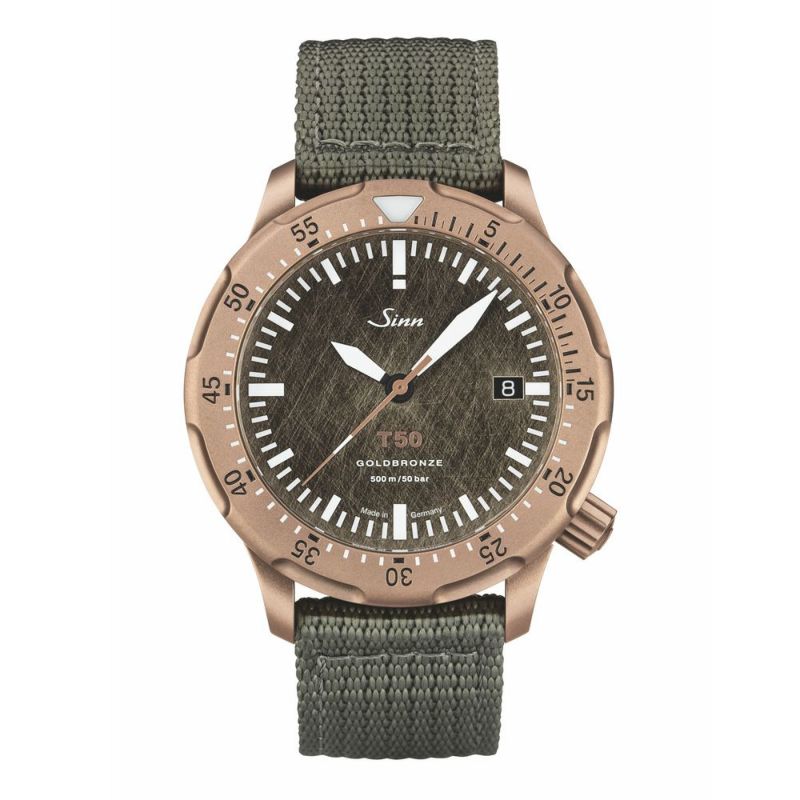 ジンは得意分野のひとつである新しい時計素材にチャレンジし、新素材「ゴールドブロンズ125」を開発しました。T50.GOLDBRONZEは、特許申請中のこのブロンズ合金をケースに採用した、世界限定300本で製作した500mの防水性能を持つダイバーズウォッチです。