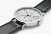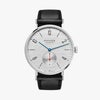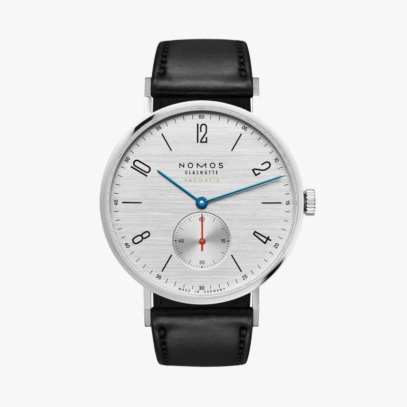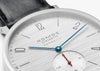 この大きくて自動巻きのノモスクラシックは、輝かしいパフォーマンスを約束するシルバーカットダイヤルで、水平方向のブラッシュ仕上げが特に印象的です。