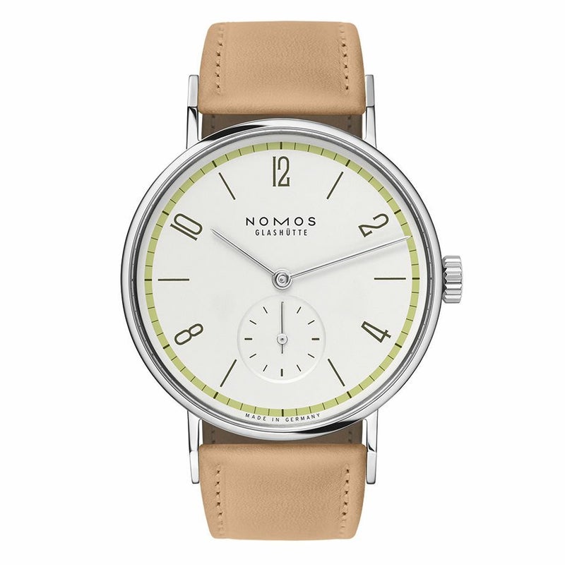ノモスの代表的なモデル「タンジェント」に日本製の草木染スペシャルストラップを備えた特別限定生産品です。日本の四季をモチーフにした中で、このモデルは「春」バージョンで、定番サイズのケース径35mmモデルです。