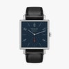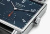 自動巻きで角型のノモスクラシック、テトラ。ミッドナイトブルーの文字盤はグリーンの分マーカーとネオンオレンジの秒針にとって完璧な背景になります。