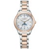 ベゼルにはサクラピンクを上品にまとわせ、白蝶貝文字板とともに、3時と9時の位置には桜の花びらをモチーフにしたパーツをあしらいました。ブルーのサン&ムーン機能が映えるシンプルな文字板に、12時と6時の位置にダイヤモンドをセッティング。艶やかさと品の良さをプラスしました。
