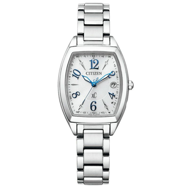 エターナルプラチナのシルバーカラーに、ブルーの針とブルーのアラビア数字のインデックスがアクセントに。