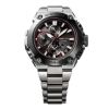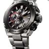 独自の小型化技術により腕に馴染むサイズ感を実現すると共に、文字板はミニマルデザインに仕上げ、日常的な実用性を追求。日本古来より受け継がれてきた強さの象徴、鎧や刀などの武具に代表される金属工芸の美意識を表現するため、チタン素材を深層硬化処理した後、ケース・バンドにはチタンカーバイト処理による発色の高い銀色を、ベゼルにはDLC処理による精悍な黒を施し耐摩耗性を強化しました。更に、文字板の随所にアクセントカラーとして鮮烈の赤を配色。甲冑の赤絲縅を思わせ、フルメタルの佇まいに威風堂々とした強さを醸し出しています。また、Bluetooth®、標準電波による時刻修正や、スマートフォン連携にも対応。素材、造形、仕上げ、機能のすべてにこだわり、強さを表現したBluetooth®搭載電波ソーラーのMR-Gです。