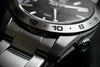 放射模様の黒ダイヤルと白いGMT針が、着ける人に洗練された印象を添えます。