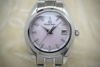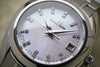 ダイヤルに使用されているピンク色の白蝶貝は、しとやかな光を湛え、角度によってほのかに輝きを放ちます。