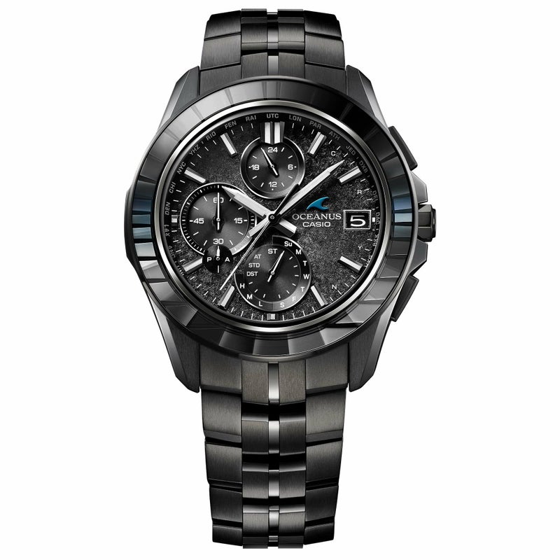 OCW-S7000CN-1Aは、OCEANUSが誇るものづくりの技術と日本の伝統技法が美しく融合したモデルです。上下で異なるカッティングラインが美しいサファイアガラスベゼルが特徴で、江戸切子の職人が一つひとつ手作業でカットを施して仕上げています。