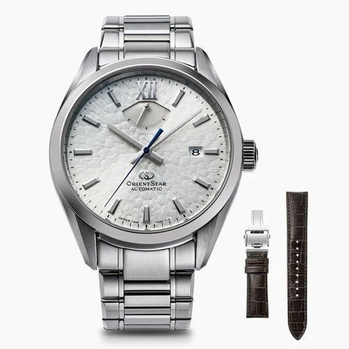 文字板は、時針、分針、秒針による中3針に加え、3時位置に日付、12時位置にオリエントスター特有のパワーリザーブの各表示を配したオーソドックスなデザインを採用する一方で、板面にはペルセウス座付近の流星群をイメージした手彫りの型模様が施されています。