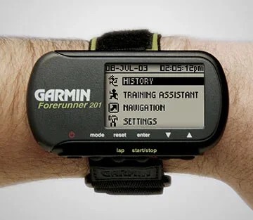これまでプロ向けの機器で技術を高めてきたガーミンは、2003年に初めて一般向けの製品を開発しました。それが、今のガーミン製スマートウォッチの原型ともなったランニング向け端末「Forerunner(フォアランナー)201」です。世界初となる、GPS機能を搭載した腕時計型ウェアラブルデバイスで、ランニングデータをリアルタイムで記録し手元で確認できるというものでした。この「Forerunner」という名称は、現在もランニング向けシリーズに使用されています。