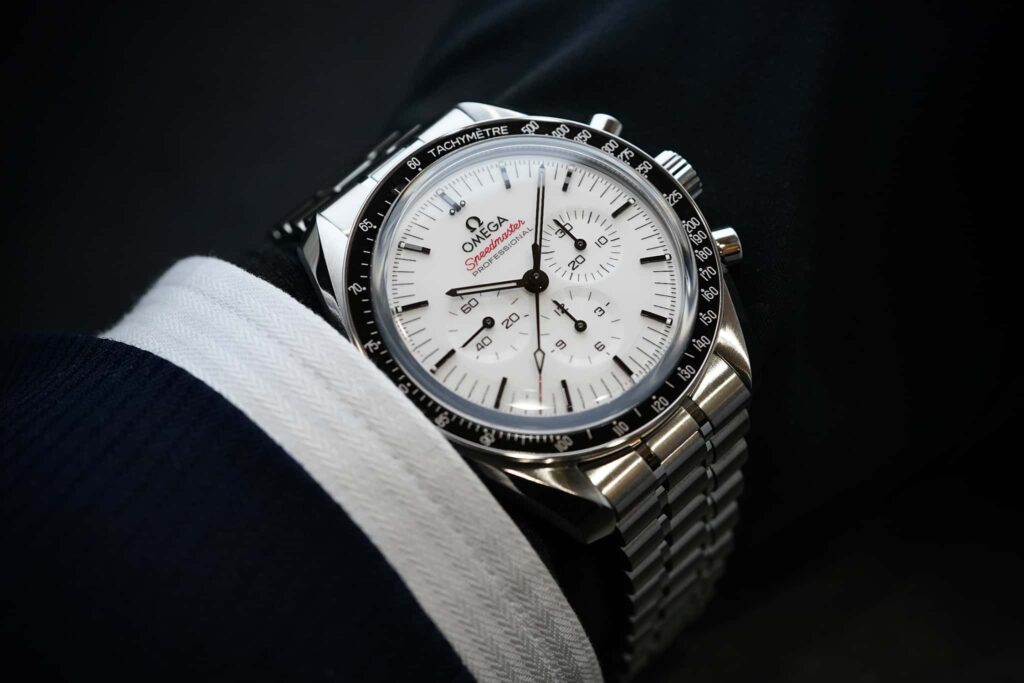 スピードマスターの中でも、近年特に注目を集めているのがこのホワイトダイアル仕様です。