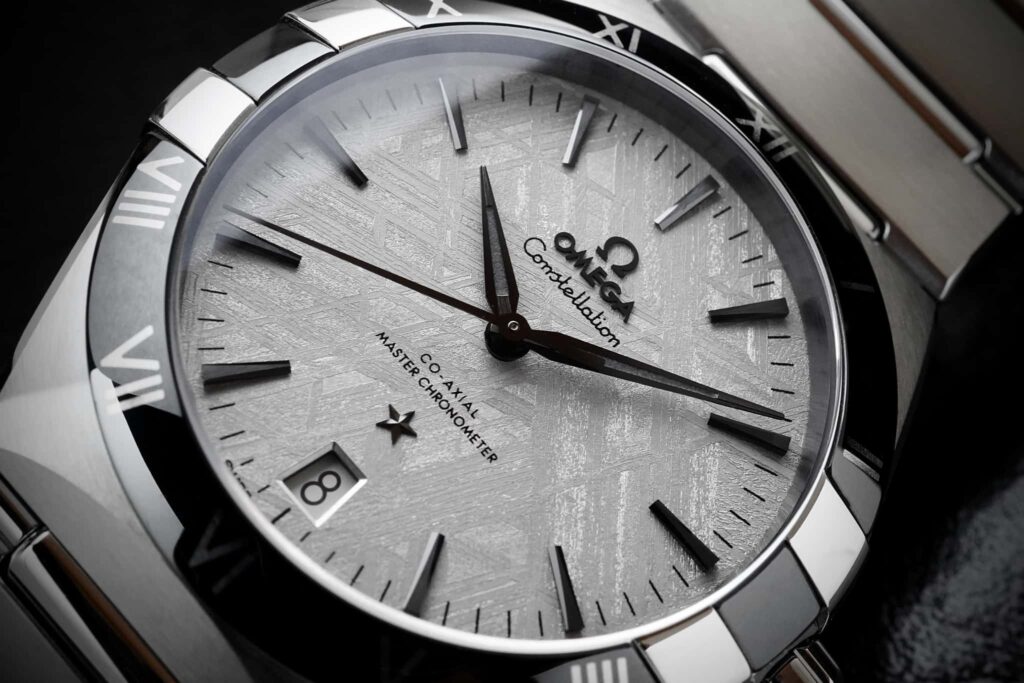 隕石(メテオライト)を文字盤に使用した特別仕様のコンステレーション。個体ごとに異なる模様を持ち、唯一無二の存在感を放ちます。